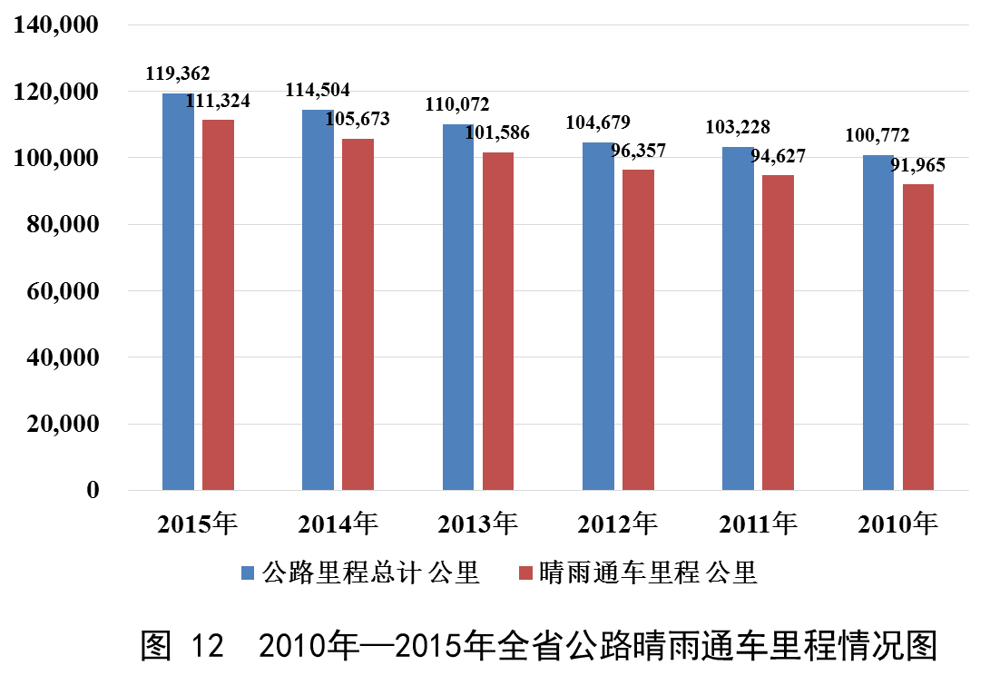 2015年末全省公路晴雨通车里程达111324公里,占公路总里程的93.3%,比“十一五”末增加19358公里、增长21.0%。