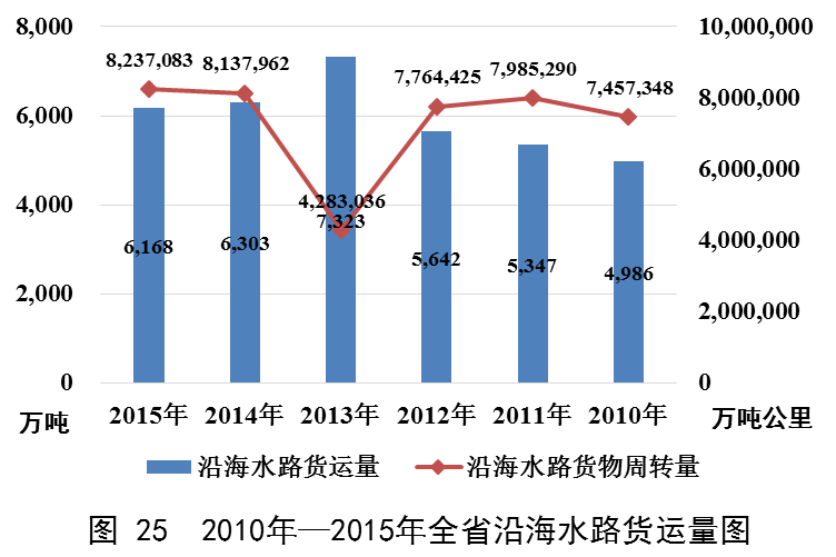 在全省水路货运中,沿海运输完成货运量6168万吨、货物周转量823.7亿吨公里;远洋运输完成货运量7271万吨、货物周转量7139.5亿吨公里。